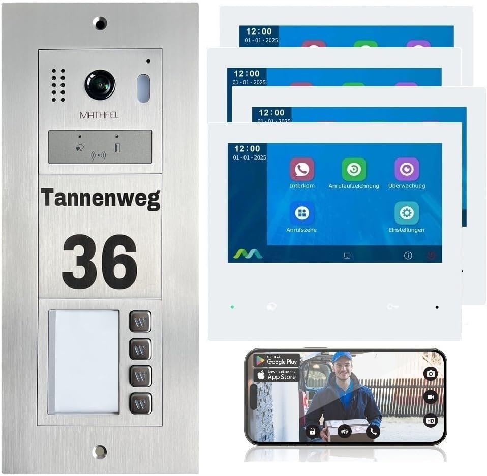 Mathfel MF-2K 2-Draht Bus WLAN Video Türsprechanlage für 4 Familienhaus, personalisierte Außenstation mit Gravur, Video Türklingel mit HD Kamera, 4x 7 Zoll Monitore, Gegensprechanlage