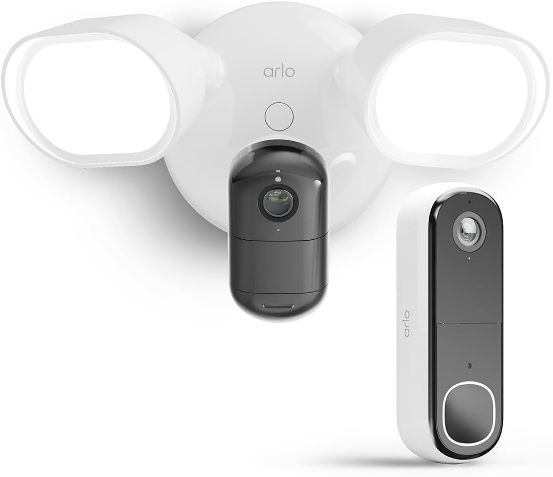 Arlo 2K Flutlicht WLAN Sicherheitskamera mit HD Videotürklingel, Nachtsicht, Sirene, LED Licht, Bewegungsmelder, 2-Wege-Audio, Arlo Secure, kabellos und kabelgebunden