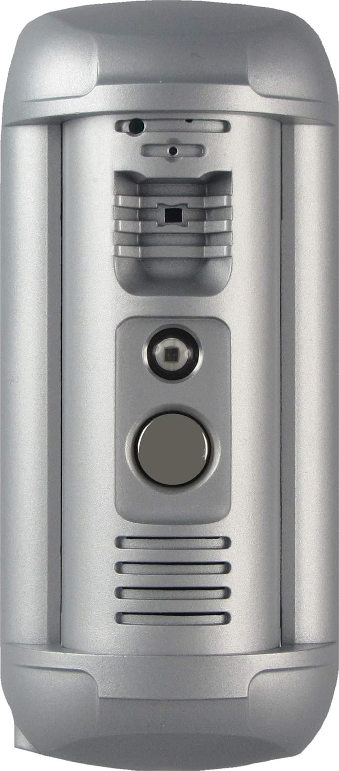 Die Türstation verfügt über ein schlichtes silbernes Gehäuse und eignet sich für die Installation im Eingangsbereich von Wohngebäuden.