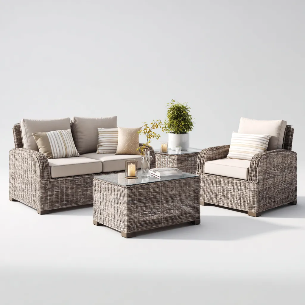 Dieses Garten Lounge Set ist für den Einsatz im Garten, auf der Terrasse oder im Wintergarten ausgelegt. Die Sitzmöbel werden durch einen Tisch und einen Beistelltisch ergänzt und bilden eine funktionale sowie harmonische Sitzgruppe für den Außenbereich.