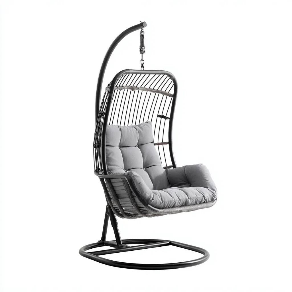 Die freistehende Bauweise ermöglicht eine flexible Platzierung ohne Deckenmontage. Die ergonomische Sitzform unterstützt eine entspannte Körperhaltung und fördert angenehmes Schaukeln.