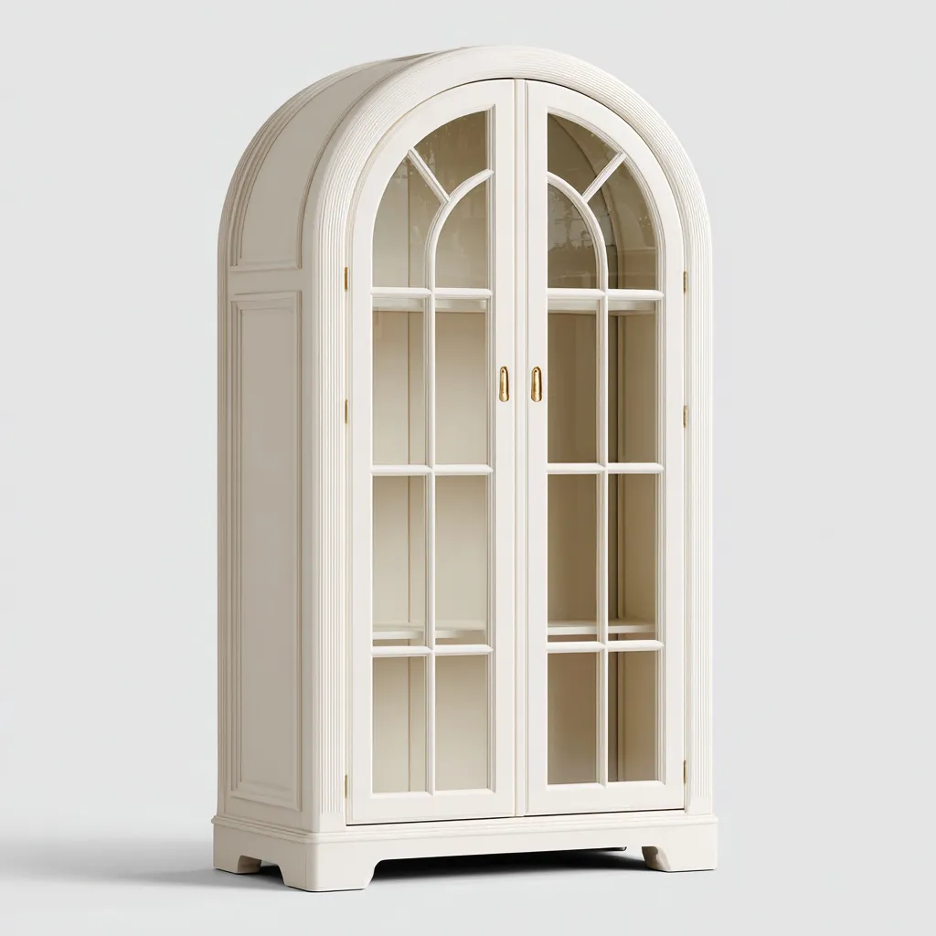 Diese Vitrine ist für Wohn- und Essbereiche vorgesehen und eignet sich zur stilvollen Präsentation von Geschirr, Gläsern oder dekorativen Wohnaccessoires. Die sanfte Farbgebung und die geschwungene Form im oberen Bereich verleihen dem Möbelstück eine ruhige und elegante Ausstrahlung.