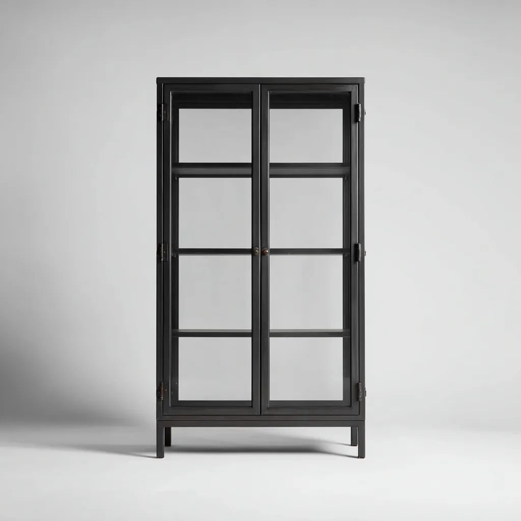 Das Möbelstück besteht aus Metall und Glas in schwarzer Ausführung. Die Konstruktion ist stabil ausgeführt, die Oberflächen sind gleichmäßig beschichtet und für den dauerhaften Einsatz im Innenbereich geeignet.