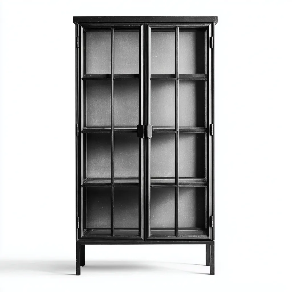 Diese Vitrine ist für Wohnbereiche, Küchen und Arbeitsumgebungen geeignet und bietet eine übersichtliche Möglichkeit zur Präsentation von Geschirr, Küchenzubehör, Büchern oder dekorativen Objekten. Das reduzierte Design mit dunklem Metallrahmen unterstützt eine klare und funktionale Raumgestaltung.